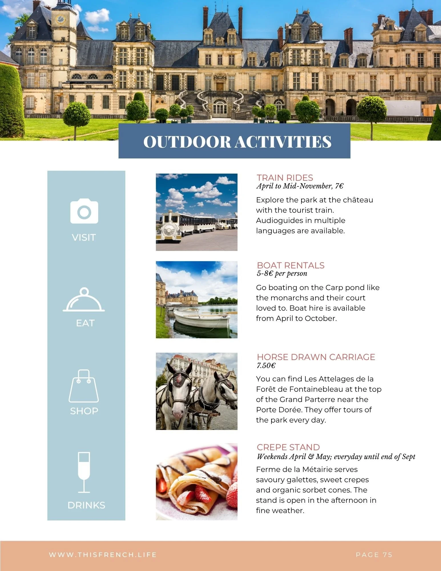 Aside from purchasing your tickets in advance via the Château de Fontainebleau website, I also suggest that you watch closely for announcements of their reenactments, events, and unique exhibitions. The castle often rotates or opens up special rooms and spaces for a limited time.